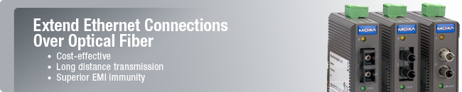 Moxa 工業(yè)級光電轉(zhuǎn)換器(工業(yè)光纖收發(fā)器)用于把以太網(wǎng)數(shù)據(jù)轉(zhuǎn)換成光纖信號,這對于延長數(shù)據(jù)傳輸距離是個非常經(jīng)濟且有效的方法。以太網(wǎng)數(shù)據(jù)在被轉(zhuǎn)換成光纖媒質(zhì)后,傳輸距離可達到80公里,同時可以抵抗電磁EMI干擾。